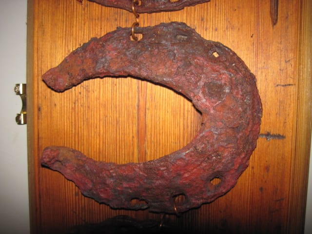 This horseshoe was found whilst metal detecting near buxton in the peak district, it dates from around 1250 , the early shoes used a T shaped nail whereas the later ones used a spiked nail, which became know as a frosty nail, for use in icy weather, we use tungsten pins now , but there is an old box of frostys still in the forge.