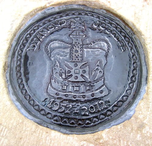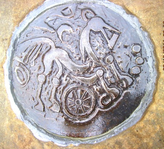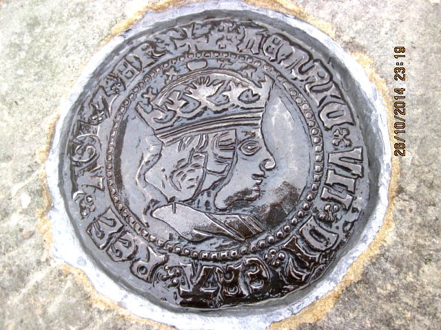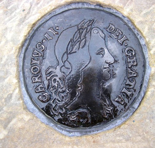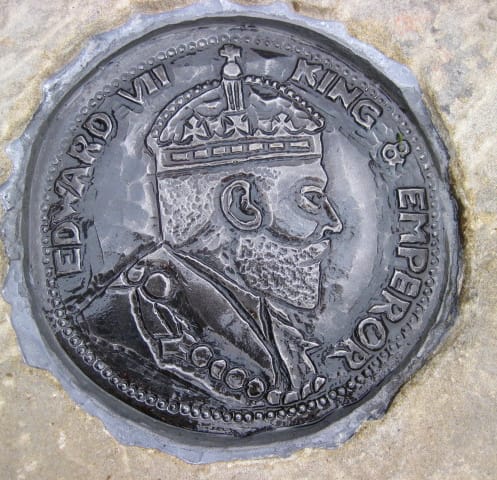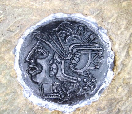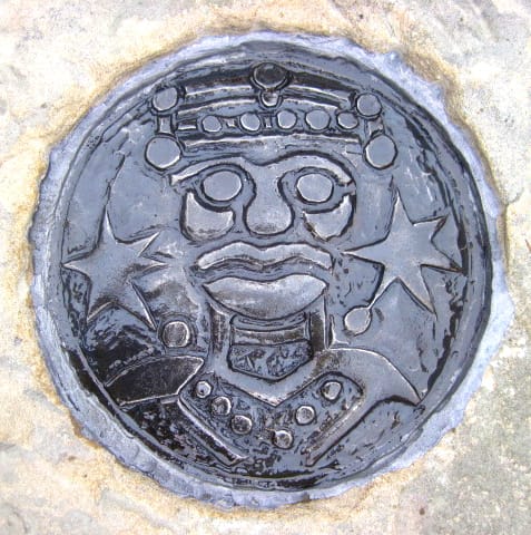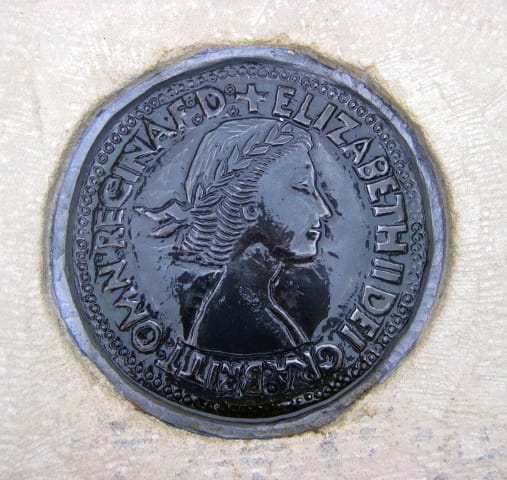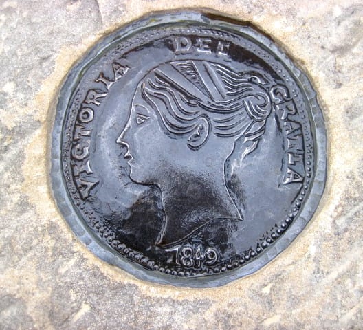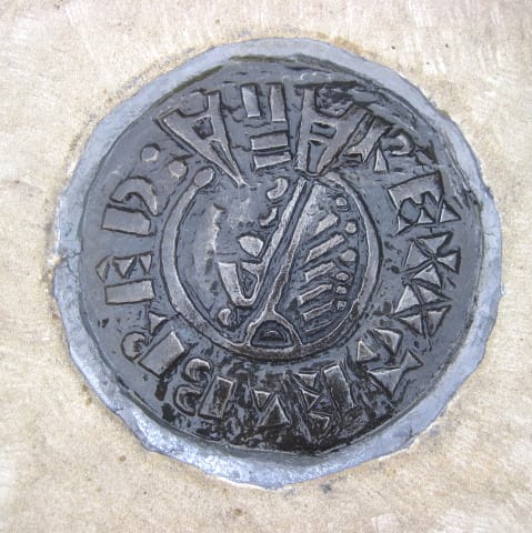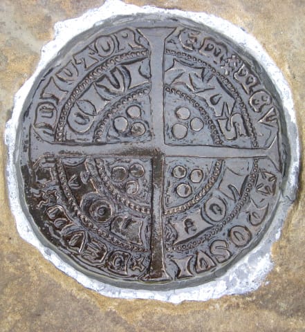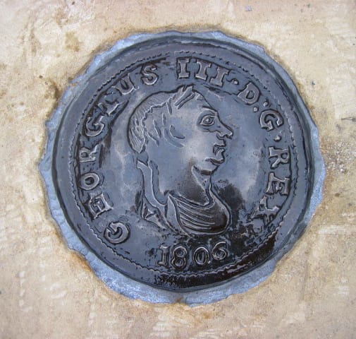 The coins are 8″ round and 1/4″ thick, they were made by forging away the background metal and leaving foreground metal standing up, this was achieved by use of various shaped punches being hammered into the metal while it was hot. The coins were then fixed into blocks of sandstone by pouring molten lead into the recess between the metal and the stone.